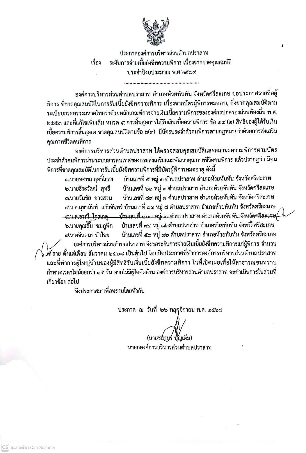 ประกาศองค์การบริหารส่วนตำบลปราสาท เรื่อง ระงับการจ่ายเบี้ยยังชีพความพิการ เนื่องจากขาดคุณสมบัติ ประจำปีงบประมาณ พ.ศ.2569