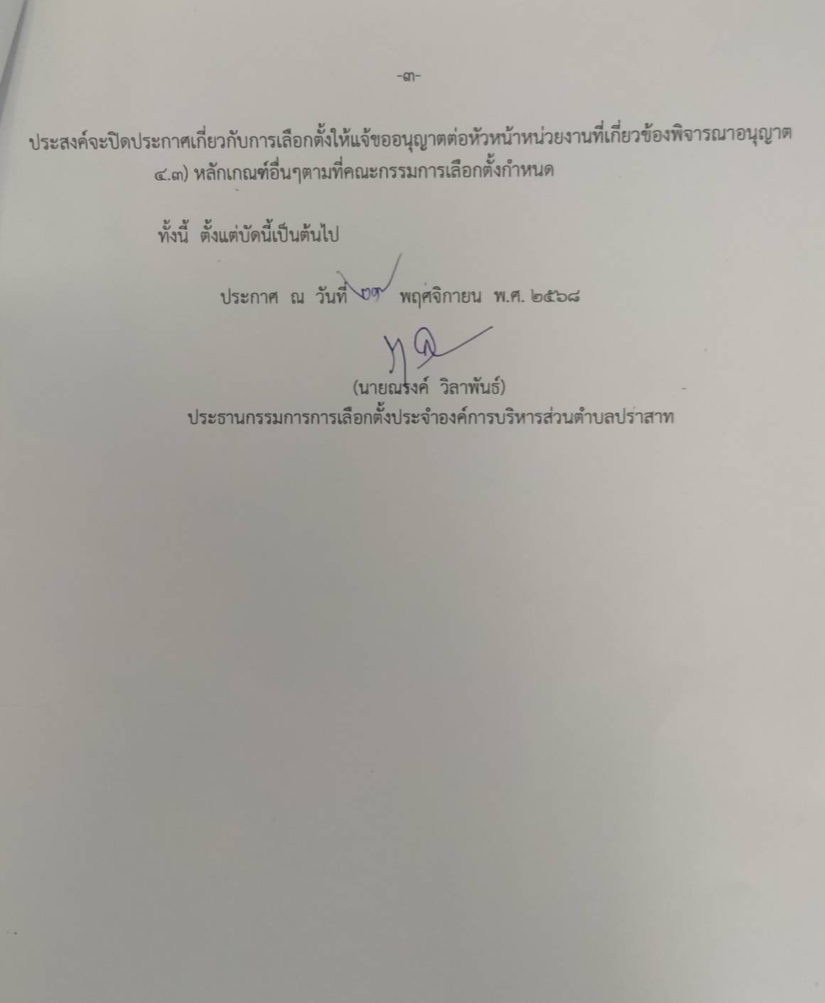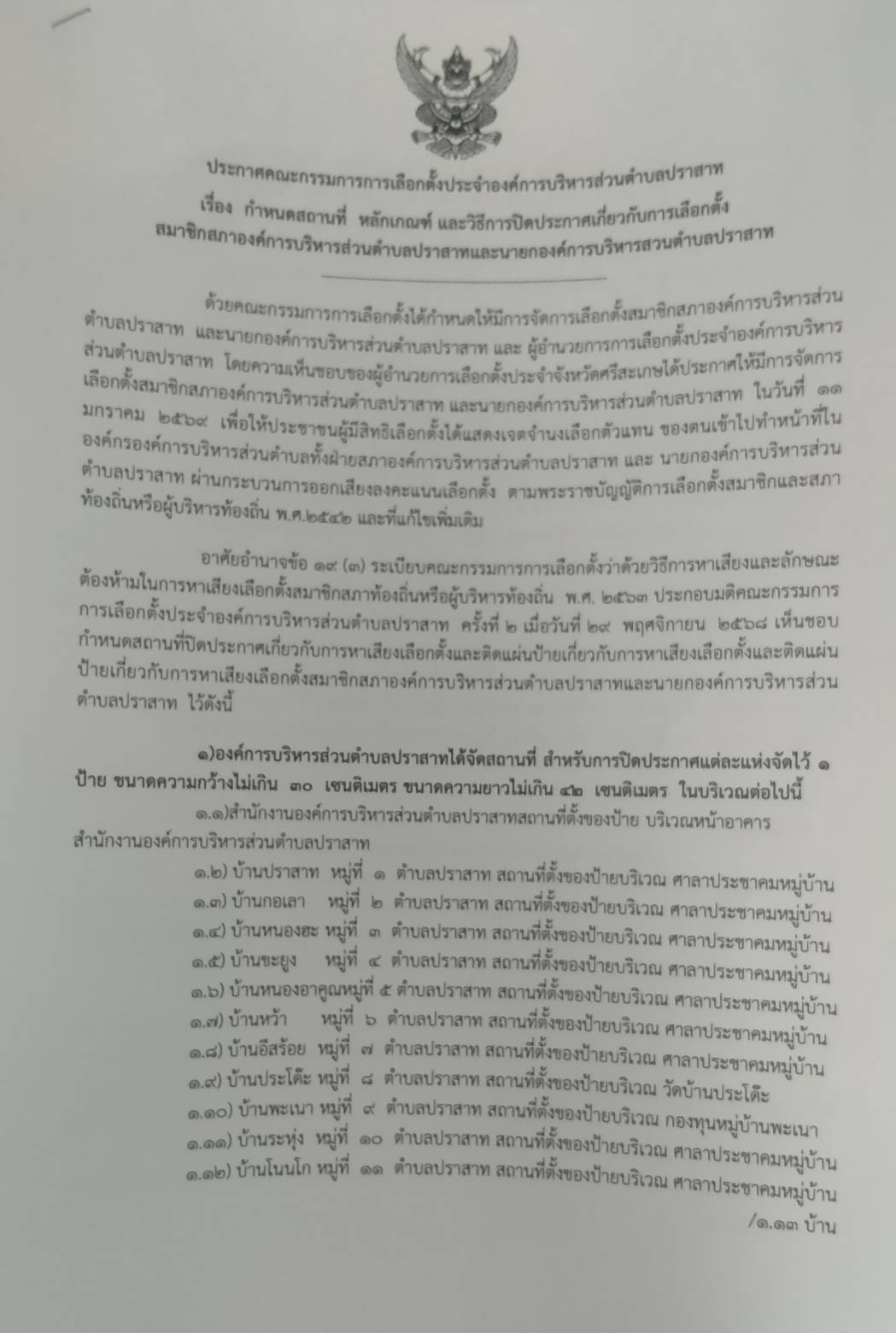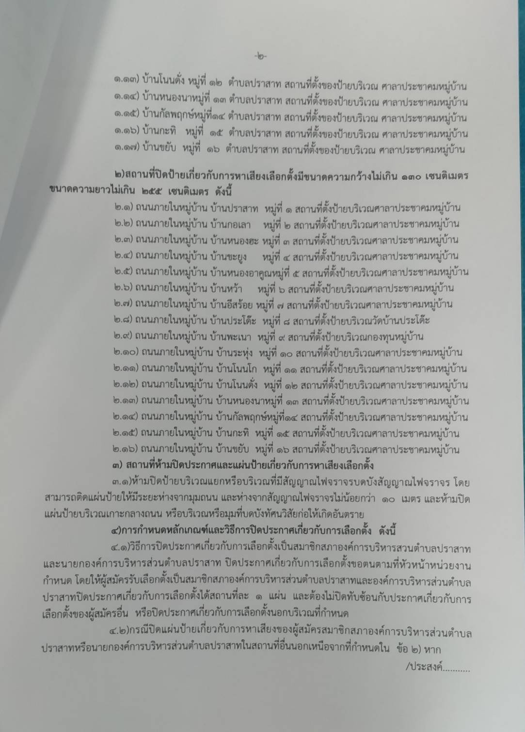 ประกาศ เรื่องจำนวนประกาศและป้ายหาเสียงเลือกตั้ง สถานที่ปิดประกาศและติดป้ายเกี่ยวกับการหาเสียงเลือกตั้งของผู้รับสมัครเลือกตั้งสมาชิกท้องถิ่นหรือผู้บริหารท้องถิ่น ตำบลปราสาท