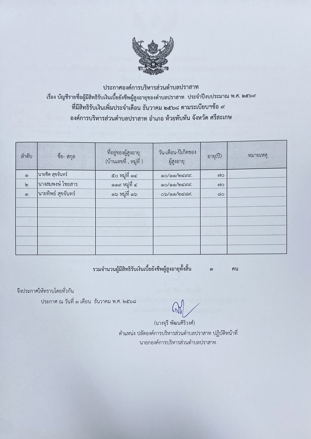 ประกาศองค์การบริหารส่วนตำบลปราสาท เรื่อง บัญชีรายชื่่อผู้มีสิทธิรับเงินเบี้ยยังชีพผู้สูงอายุของตำบลปราสาท ประจำปีงบประมาณ พ.ศ.2569 ที่มีสิทธิรับเงินเพิ่มประจำเดือน ธันวาคม 2568 ตามระเบียบข้อ 9