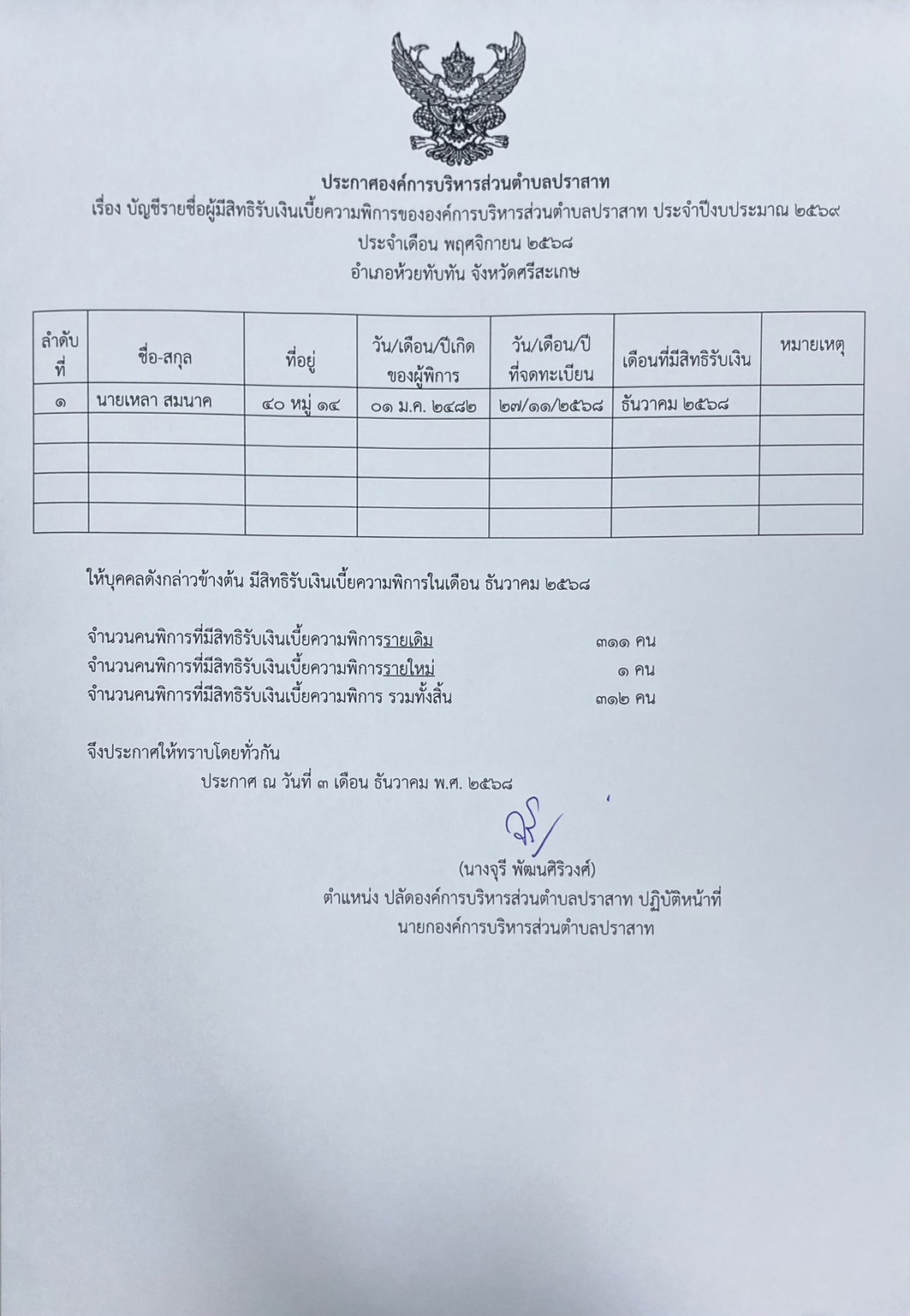 ประกาศองค์การบริหารส่วนตำบลปราสาท เรื่อง บัญชีรายชื่่อผู้มีสิทธิรับเงินเบี้ยความพิการขององค์การบริหารส่วนตำบลปราสาท ประจำปีงบประมาณ พ.ศ.2569 ประจำเดือน พฤศจิกายน 2568