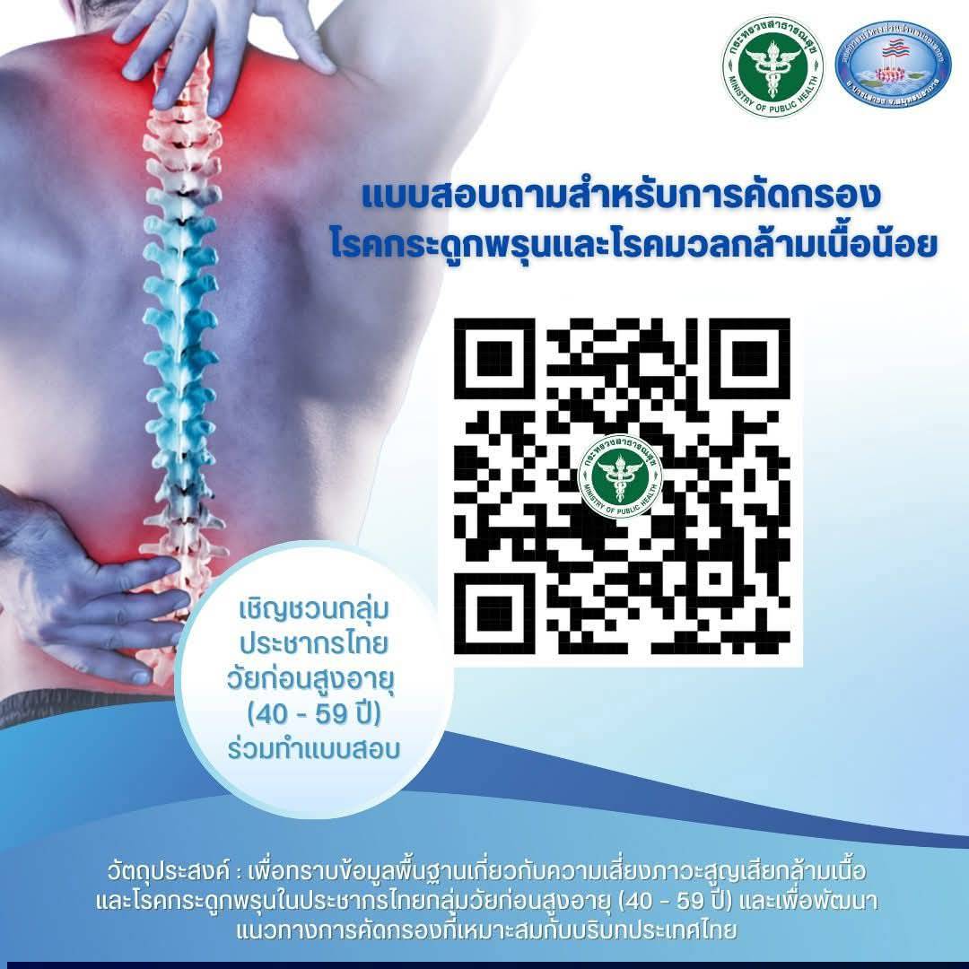องค์การบริหารส่วนตำบลปราสาทขอประชาสัมพันธ์ ขอเชิญชวนประชาชน กลุ่มวัยทำงานและวัยก่อนสูงอายุ (อายุ 40–59 ปี) ร่วมตอบแบบสอบถามเรื่อง การลดโรคไม่ติดต่อเรื้อรัง (NCDs) และการคัดกรอง โรคกระดูกพรุน–โรคมวลกล้ามเนื้อน้อย ข้อมูลของท่านจะเป็นประโยชน์ในการวางแผนส่งเสริมสุขภาพและพัฒนาคุณภาพชีวิตในพื้นที่ สแกน QR Code หรือคลิกลิงค์ https://bit.ly/49EJRsL